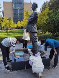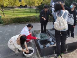 中午12点饭后,大家自带清洁用品前往东门”全心全意为人民服务“石碑集合。在班级劳动委员的组织下,大家被分为五组各自前往校园内主要的雕像。