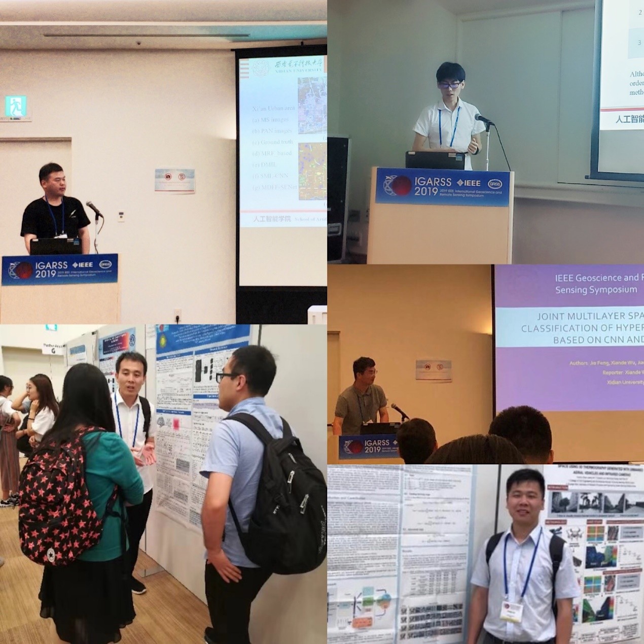 实验室在IGARSS 2019共录用论文19篇,在大会上以口头报告和墙展的方式与参会人员做了广泛和深入的交流。论文内容主要针对合成孔径雷达(SAR)、极化SAR、高分辨率遥感光学影像、高光谱影像、激光雷达(LIDAR)及光学遥感视频等数据,借助各种主流前沿的深度神经网络模型(如深度卷积神经网络、深度生成对抗网络以及各类特征融合网络等等)为主要研究工具,并以传统机器学习算法和遥感图像处理技术为辅,涵盖了从模糊的小目标到尺度变化明显的大目标,从单一场景到多分辨场景,从单一数据到多种数据融合等方面,从而解决特征提取、场景与地形分类、变化检测、语义分割、图像检索、目标检测与追踪等遥感领域应用难题,受到了本领域国内外专家、学者的高度认可。
