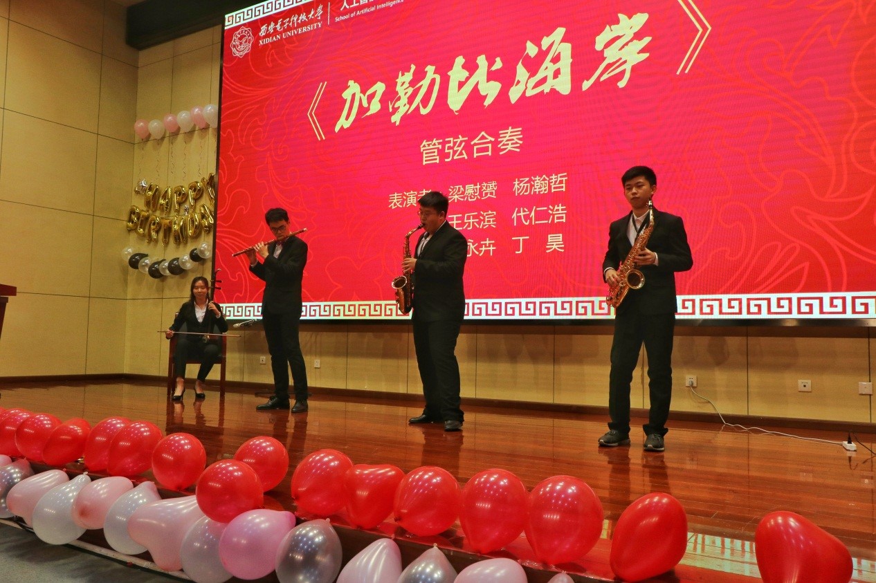 生日会的才艺展示引来全场观众雷鸣般的掌声。五种形式的舞蹈串烧,时而飘逸、时而动感,美仑美奂,展示着智能学子青春向上的风采;歌曲串烧中,智能院师生同台共唱,展现了师生相协,携手向前的默契;组诗朗诵《因为AI》记录了智能院走过的酸甜苦辣,表达了共创辉煌、共同前进的豪情壮志;当钢琴、萨克斯、竖笛和二胡相遇,《加勒比海盗》呈现出另外一番风味,让人回味无穷。
