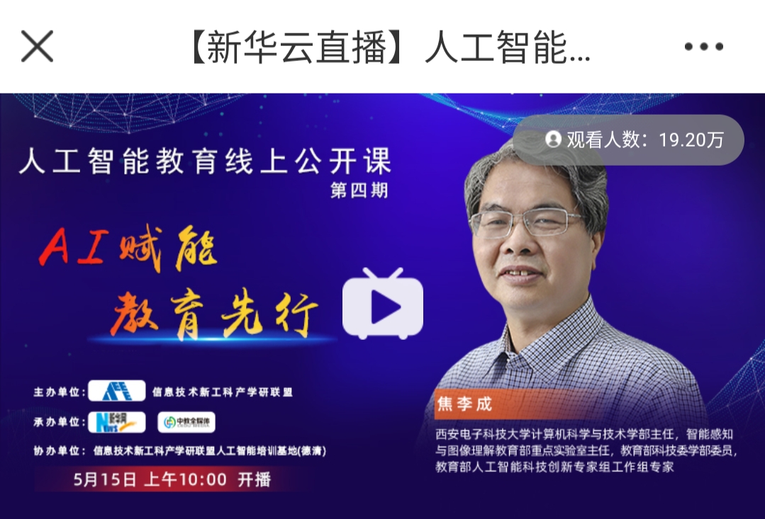 2020年5月15日,由信息技术新工科产学研联盟主办,华网、中教全媒体承办,信息技术新工科产学研联盟人工智能培训基地(德清)协办的“人工智能教育线上公开课”第四期,在新华网客户端云直播及中教全媒体直播平台同步播出。计算机科学与技术学部主任、beat365平台官方网站焦李成教授做了题为“人工智能人才培养的挑战与思考”的精彩报告。