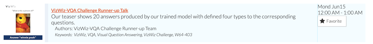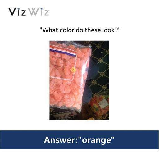 VizWiz-VQA Challenge旨在设计能够回答视障人士提出的视觉问题的算法,其数据集为VizWiz-VQA数据集。该数据集由每个视障人士所拍摄的图像并语音记录有关该图片的语音问题,以及关于每个问题的10个众包答案组成。该比赛针对该数据集解决以下两个任务:预测视觉问题的答案;预测视觉问题是否可以回答。赛事希望能够引导更多的人了解视障人士的技术需求,同时为研究人员提供新的研究方向,以开发辅助技术,为视障人士打造更加无障碍的生活。