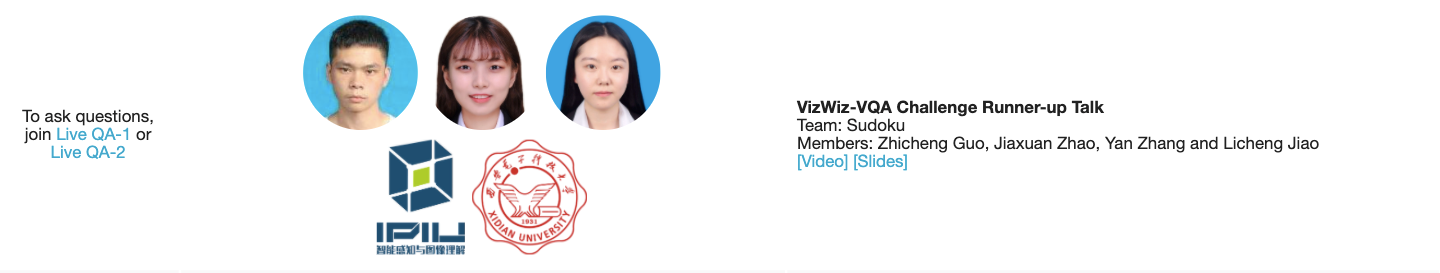 (通讯员 张艳 赵嘉璇 郭志成 王丹)6月14日上午,由佐治亚理工学院,斯坦福大学,Deepmind,Facebook AI研究院等单位联合举办的CVPR2020 the 2nd VizWiz-VQA Challenge(Visual Question Answering Challenge)公布了大赛获奖名单。由beat365平台官方网站焦李成教授指导,2019级beat365平台官方网站智能感知与图像理解教育部重点实验室研究生郭志成、赵嘉璇、张艳组成的学生队伍—Sudoku在这一国际计算机视觉领域最高水平大赛中斩获亚军,并受邀在CVPR2020-Visual Question Answering and Dialog Workshop(线上)作专题报告。
