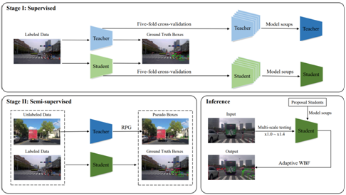 亚军方案:队伍提出一种两阶段自训练教师-学生框架,使用一个两阶段检测器作为教师模型为单阶段检测器的学生模型提供多样性的伪监督信号。在第一阶段,通过集成学习与模型融合Model Soups构建了鲁棒的教师、学生模型。在第二阶段,教师模型通过可靠的伪标签生成策略为学生模型提供高质量的伪监督信号。在推理阶段,队伍设计一种有效的后处理流程,由多尺度测试、Model Soups以及自适应加权框融合构成。队伍突破了基于自训练的半监督学习范式的关键技术,实现了自动驾驶技术中道路目标对象检测精度的显著提升