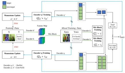 亚军方案:队伍提出一种具有交叉解耦知识蒸馏的双支教学方案,突破了少样本图像分类数据增强与知识蒸馏的关键技术,实现了在有限数据下提升分类器识别与抗噪性能。该方案从数据端引入AutoMix样本混合策略实现样本分布多样性以及特征端引入交叉解耦知识蒸馏算法实现模型知识多样性两方面来提升分类器的识别能力。基础分类器使用HorNet以及ConvNeXt,在训练过程中两个模型互为老师以及学生两个身份。然后对训练好的模型先使用Model Soups进行模型集成,再使用测试增强进行推理,最后使用少数服从多数的投票策略进行结果融合获取最终分类输出。