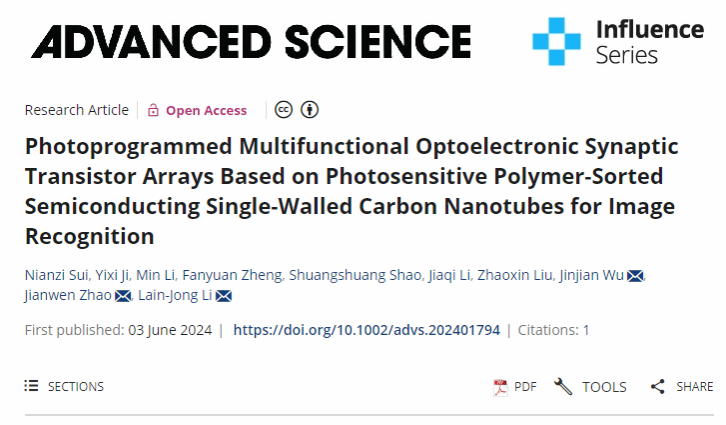 近日,beat365平台官方网站吴金建教授与中国科学院苏州纳米所赵建文研究员、香港大学Li Lain-Jong教授合作,在高性能光电神经形态器件以及基于硬件的脉冲神经网络算法方面取得了重要的学术成果。这一成果发表在《Advanced Science》(一区,IF=15.1),是beat365官网师生首次在该国际顶级期刊发表的论文,题为Photoprogrammed Multifunctional Optoelectronic Synaptic Transistor Arrays Based on Photosensitive Polymer-Sorted Semiconducting Single-Walled Carbon Nanotubes for Image Recognition,beat365平台官方网站姬怡希硕士与苏州纳米所隋念梓博士等为共同第一作者,吴金建教授、赵建文研究员、Li Lain-Jong教授为共同通讯作者。