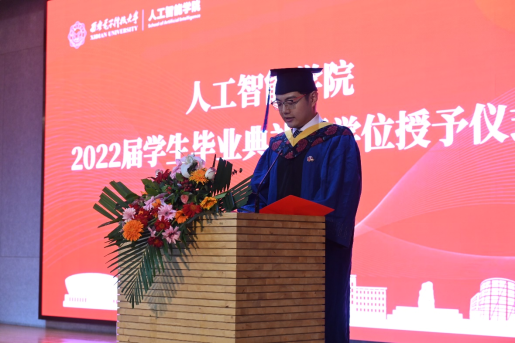 优秀毕业生代表邵奕霖在发言中首先感谢学院的照顾与培养、感谢老师的传道授业解惑,为同学们的学习生活保驾护航、遮风挡雨。他号召毕业生以国家发展、社会进步、人民幸福和人类福祉为先,将勇闯“无人区”,敢做“领头雁”的精神继续传承下去, 在新一代人工智能快速发展中贡献西电智慧。