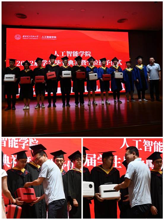在激动人心的授位环节,首先由侯彪教授依次为校级优秀硕士学位获得者、本科优秀毕设论文获得者、本科优秀毕业生干部授位拨穗并颁奖。随后学院老师依次为毕业生颁授学位,执拨穗礼并合影留念,整个过程气氛热烈而不失庄严。