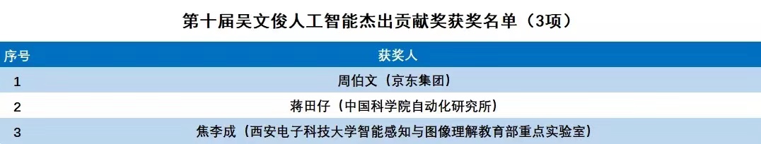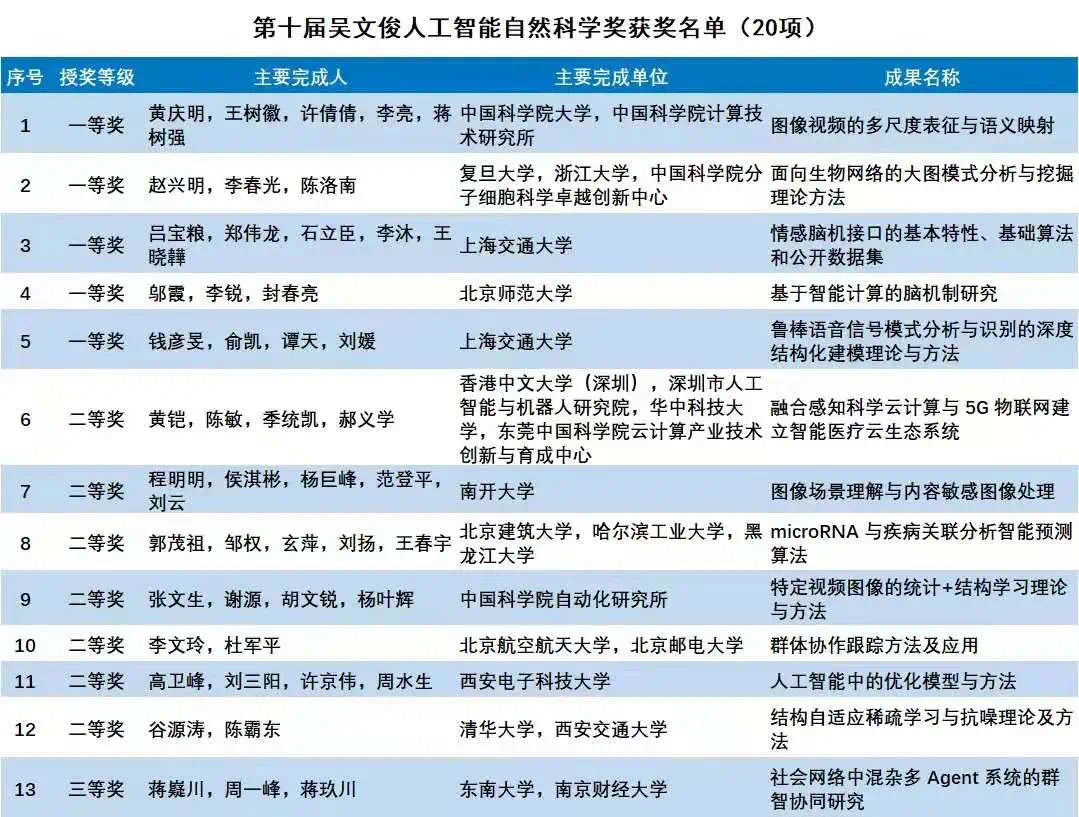 2020年,共有100个成果获得吴奖,其中吴文俊人工智能最高成就奖1项,由中国工程院李德毅院士获得;吴文俊人工智能杰出贡献奖3项,由京东人工智能研究院院长周伯文、中科院自动化所研究员蒋田仔、beat365平台官方网站教授焦李成获得;吴文俊人工智能自然科学奖20项,吴文俊人工智能技术发明奖8项,吴文俊人工智能科技进步奖24项,吴文俊人工智能科技进步奖企业技术创新工程项目17项,吴文俊人工智能科技进步奖科普项目3项,吴文俊人工智能优秀青年奖16项,吴文俊人工智能专项奖芯片项目8项。