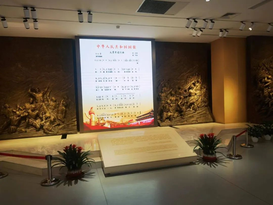 国歌纪念广场以唱片的造型设计成大型的开放式圆形广场,寓意着《义勇军进行曲》从上海唱响全中国。西南侧的国歌展示馆通过实物陈列、场景再现、多媒体互动展示,生动演绎了《义勇军进行曲》从电影《风云儿女》的主题歌到成为中华人民共和国国歌的伟大历程。5大乐章精品陈列、4处仪式教育场所、18处多媒体互动场景,50个国歌故事多重演绎,都无处不在地向青马学员们展示着璀璨的红色文化魅力。
