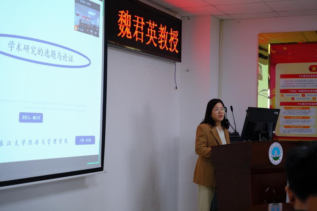 (通讯员:李娜/文 何小艳/图)11月19日上午九点,“长大经管论坛”第四十九讲在文科楼505会议室举行。此次讲座的主题为“学术研究的选题与论证”,主讲人为304永利集团官网入口魏君英教授。本次论坛由304永利集团官网入口副院长何蒲明主持,304永利集团官网入口硕士生导师和全日制研究生线下参与、非全日制研究生线上同步参加。