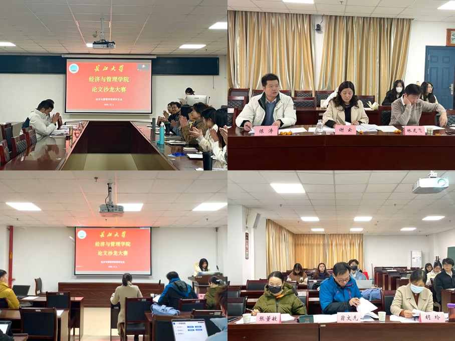 (通讯员:张悦、付玉婷)12月6日上午9时,永利集团官网于文科楼505、605会议室举行2022年研究生学术沙龙大赛,本次大赛分为经济场和管理场,采取线上线下相结合的方式进行。大赛邀请到谢云副教授、林龙飞副教授和陈涛老师担任经济场评委,翁文先副教授、胡玲老师、张董敏老师担任管理场评委,裴潇副院长、辅导员朱翠玲老师、黄承石老师受邀参会。