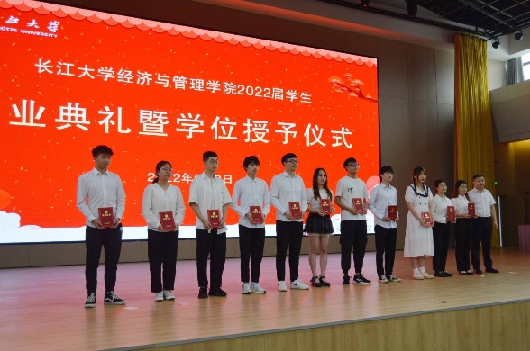 随后,毕业典礼在庄严的国歌声中正式拉开帷幕。王中梅宣读表彰文件,徐辉和徐波先后为荣获“考研之星”和“优秀毕业生”荣誉称号的毕业生代表颁发荣誉证书并合影留念。