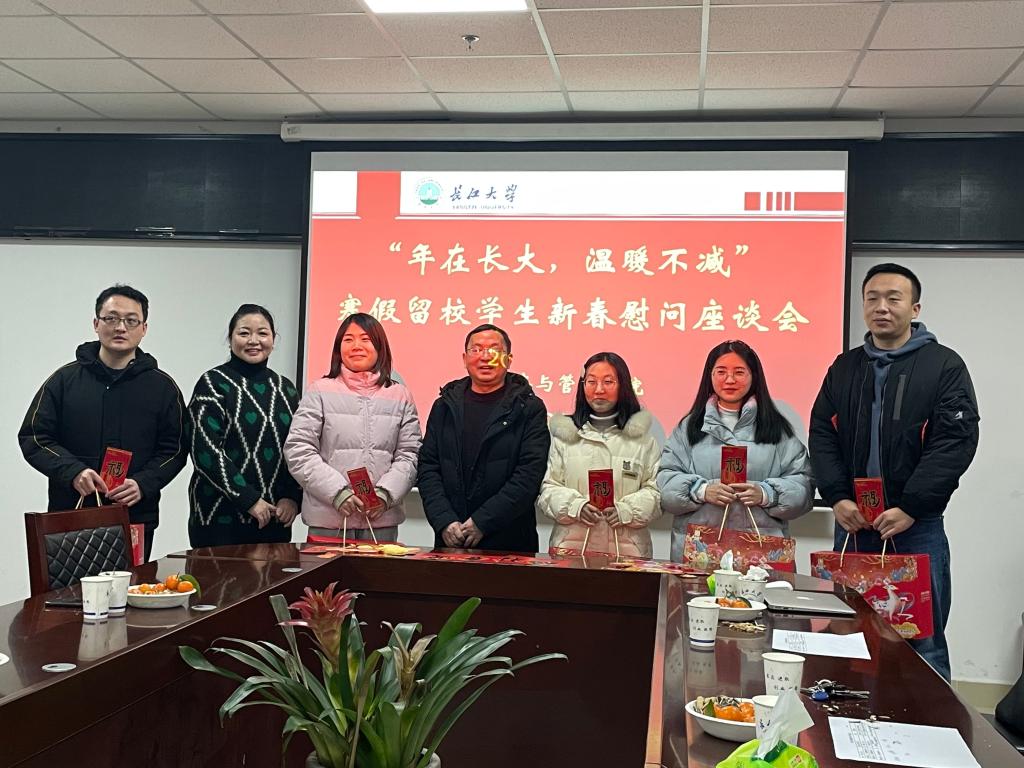 会议开始,王书记向同学们介绍了参加座谈话的各位老师,然后5名学生代表依次汇报了自己的学习、生活情况,以及春节期间的安排,樊书记亲切询问了大家春节假期的衣食住行是否便利,以及考研学习计划和实习就业情况,并叮嘱大家遵守疫情防控要求,做好时间安排,坚持学习,劳逸结合,与家长和老师保持联系,开心过春节。随后,王书记对安全问题进行了进一步强调,提醒大家有任何困难都要及时联系老师。最后,老师们一起向同学们送上了美好的新春祝福,大家一起合影留念。