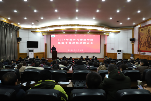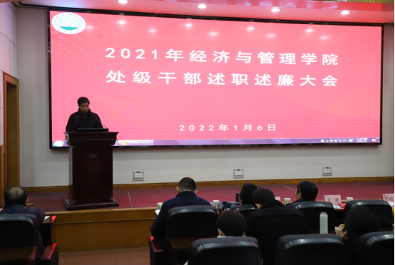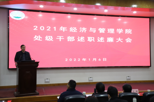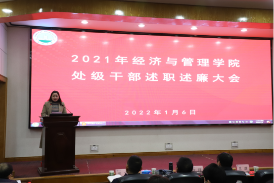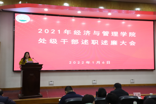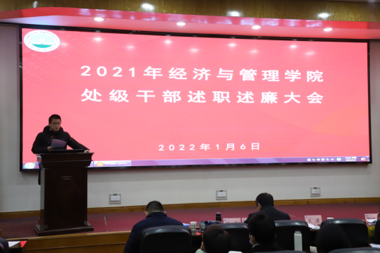 (通讯员:彭蓉 / 摄影:涂雷)根据校党委的统一安排和部署,2022年1月6日下午,304永利集团官网入口在11教学术报告厅召开2021年度领导干部述职述廉大会。学校第二考核组成员到会指导并组织开展考核工作。学院领导班子全体成员、全体教职工120余人参加会议。 学院党委书记樊帆主持会议。