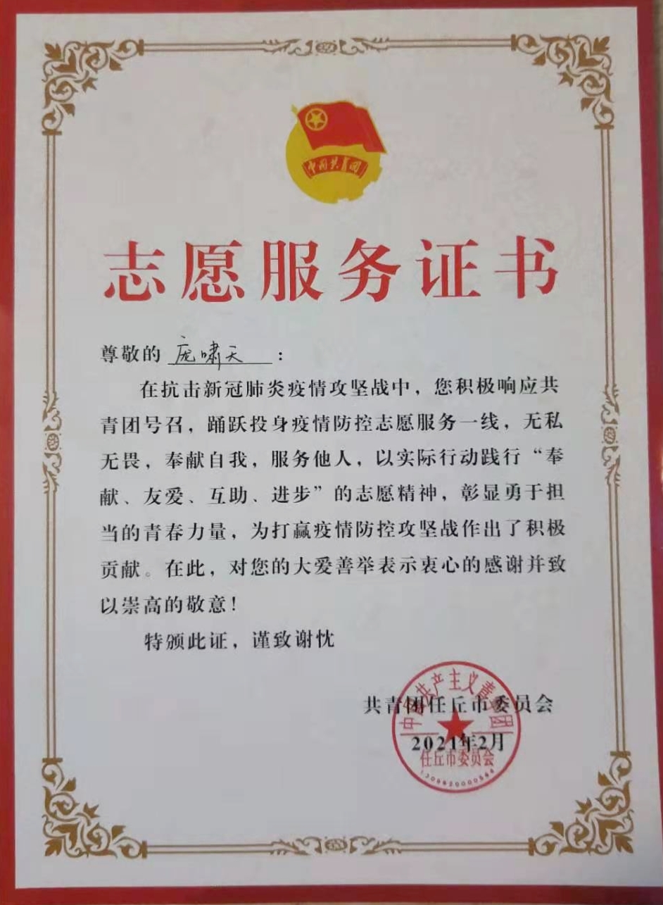 近日,永利集团官网本科生庞啸天同学收到来自河北省沧州市任丘市颁发的志愿服务证书,证书上对于庞啸天同学自1月15日以来主动请缨担任社区防疫志愿者,并无私、出色地完成任务表示感谢。