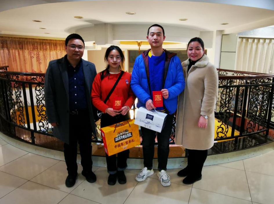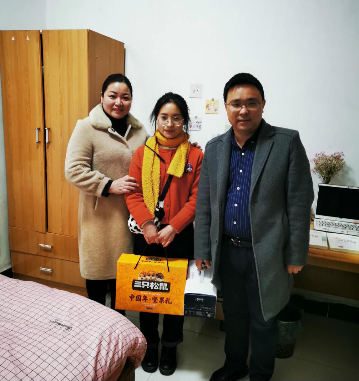 在新春佳节即将来临之际,2021年2月10日下午,304永利集团官网入口党委副书记王中梅、学工办主任陈思杭和辅导员娄君庭一同走访东校区汉科、新风公寓区域,慰问永利集团官网财务11802班王泽霜和物流11702班韩连贵的二名留校学生,陪同学生一起团年并送上美好的新春祝福。