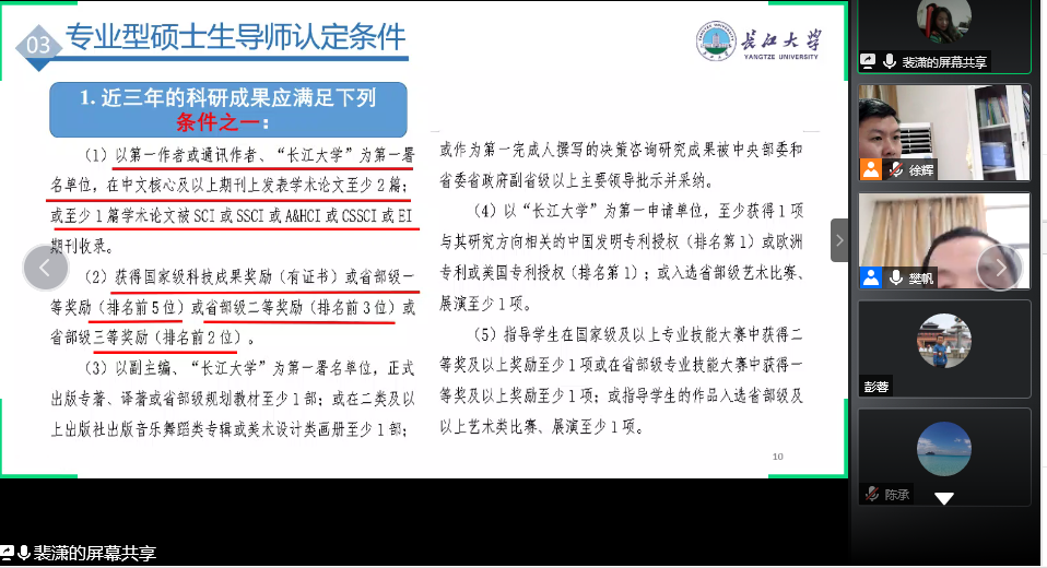 裴潇副院长就研究生日常教学、人才培养、毕业生论文评审、2018级研究生在线开题报告答辩、2020年研究生远程招生复试、制定《学院硕士研究生学位申请的科研(实践)成果规定》六个方面进行了研究生工作的汇报。通报了近期研究生远程招生工作的进展情况,并重点解读了《304永利集团官网入口教师招收研究生资格认定办法(试行)》 、《304永利集团官网入口硕士学位授予工作实施细则》两份校发文件。
