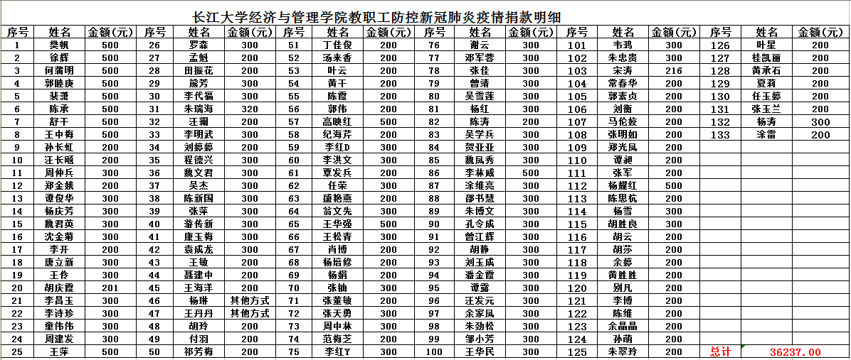 为了动员更广泛的力量,彻底打赢疫情防控阻击战。学院防控工作领导小组组织全院教职工参与疫情防控捐赠活动,号召全体党员更要发挥疫情防控的先锋模范作用,履行社会责任,学院133名教职工共计捐款36237.00元,已通过学校工会捐赠给荆州市红十字会。杨庆芳和陈新国老师组织其他方式捐款捐物用于抗击新冠肺炎。