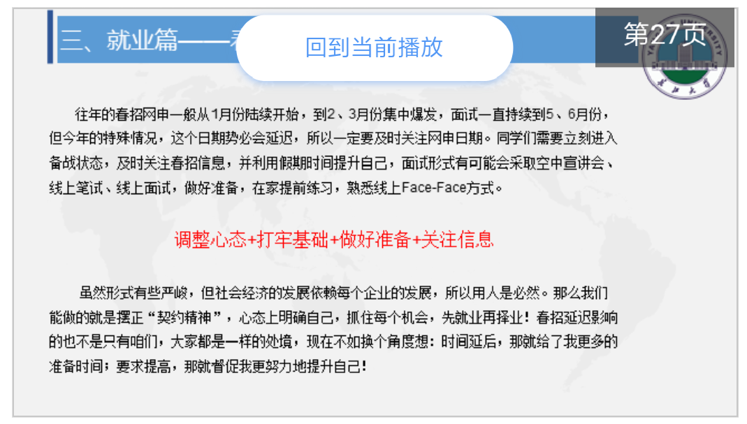 为了让学生清醒认识当前的就业形势、熟悉就业政策,2月16日学院也通过“雨课堂”平台以直播的形式召开毕业生就业主题大会,全体毕业年级学生参加了此次大会,会议由年级辅导员朱翠玲、叶星主讲。在主题大会中,朱老师针对疫情特殊时期下的就业现状和就业工作,和同学们做了全面的分析和动员,希望学生们要调整心态、打牢基础、做好准备、关注信息。既不能过度焦虑,也不失“紧迫感”,特别对于考研的同学们,更要以积极的心态等待考研成绩,及时调整就业规划。