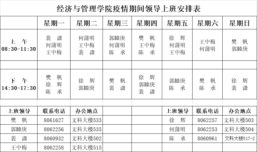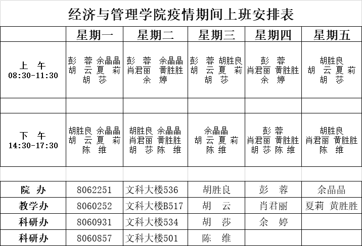 备注:本安排从4月6日起开始执行,在办公室值班,直到疫情结束。