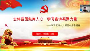 (通讯员 杨贵鹏)为深入学习贯彻党的十九届五中全会精神,12月22日下午,beat365平台官方网站硕士党支部在线上组织进行十九届五中全会精神宣讲活动,硕士191支部书记杨贵鹏和硕士202支部书记王璐围绕“宏伟蓝图鼓舞人心,学习宣讲凝聚力量”的主题进行了宣讲,全体党员及积极分子参加。