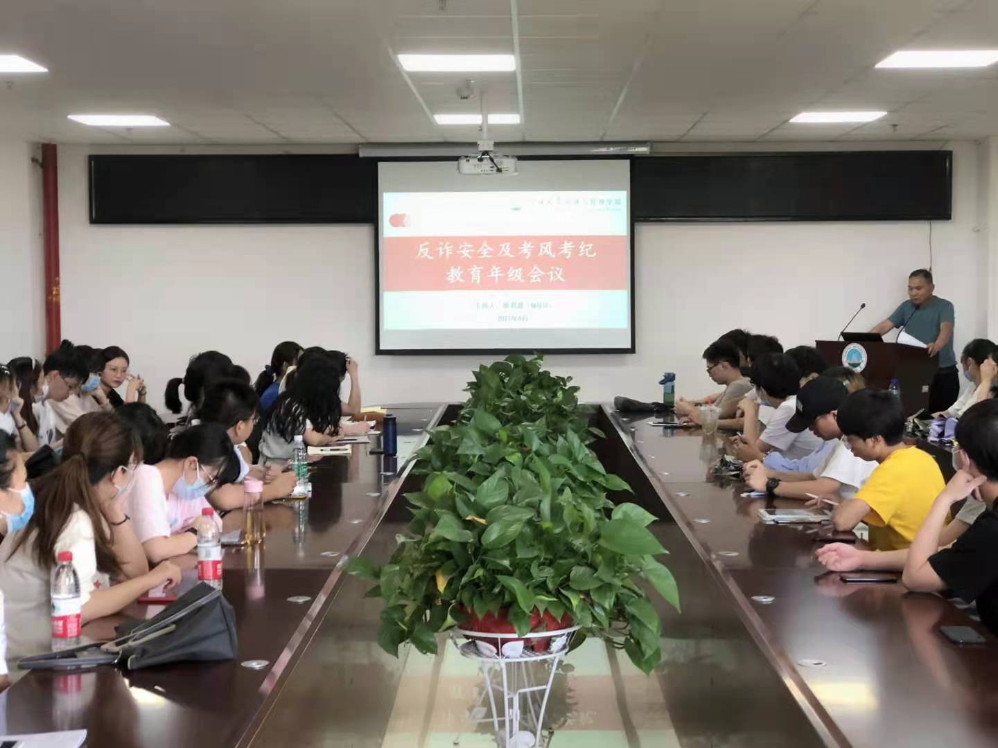 (通讯员 苏帅)304永利集团官网入口于2021年6月7日中午12.30在文科大楼召开了18级管理类考风考纪及反诈安全教育大会。本次会议由李博老师主持,年级辅导员娄君庭老师,各班班长及学生干部参加本次会议。