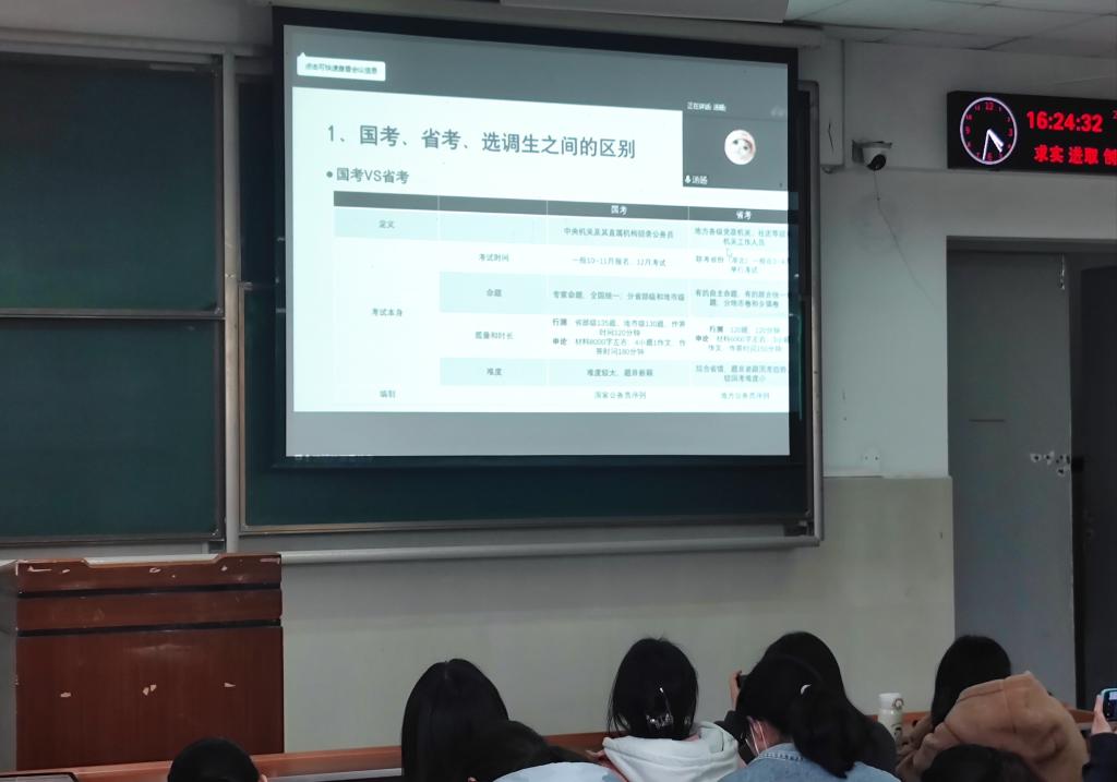 分享会伊始,汤旸学姐上岸绝非躺平”抛砖引玉,强调考公需要付出更多的努力,从心理准备开始,发自内心地认同党信任党,日常生活中以“准公务员心态”要求自己,关注时政新闻,注重日常积累;还要从自身定位出发,制定短期计划辅助长期计划逐步达成个人目标。会,汤旸学姐根据具体示例进行笔试做题技巧分享,播放的模拟面试视频更让大家身临其境,在场的同学们收获颇丰。最后,会计12001班吴婷婷对备考时间安排及相关学习方法提出疑问,汤旸学姐进行了详细解答