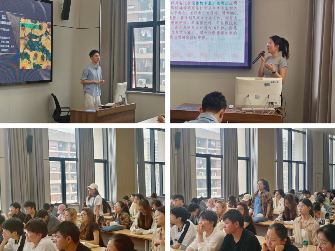 陈晋晋学姐则以“从犹豫到坚定”的考研心路历程为主题,分享考研择校的“三步法”:评估自身能力、明确读研目的、对标院校报录比。针对所考专业专业课的学习,她建议扎实学习、着重背诵,并分享了自己专业课的有效背诵方法。面对目前同学们焦虑迷茫的心理,陈晋晋学姐鼓励大家“每一次咬牙坚持,都是向理想更近一步”。在互动环节,同学们踊跃提问,针对“专业课与公共课学习”“复试准备”等焦点问题,两位分享人结合实例耐心解答,现场气氛热烈。