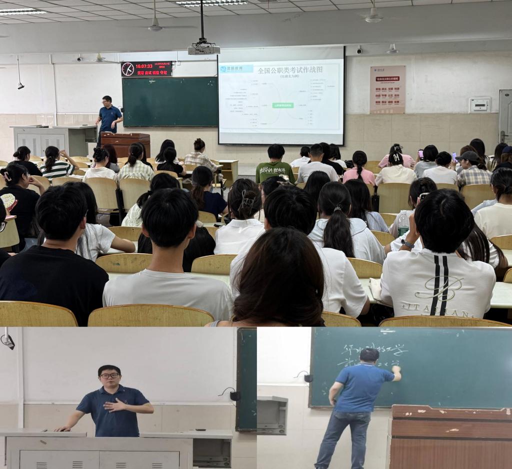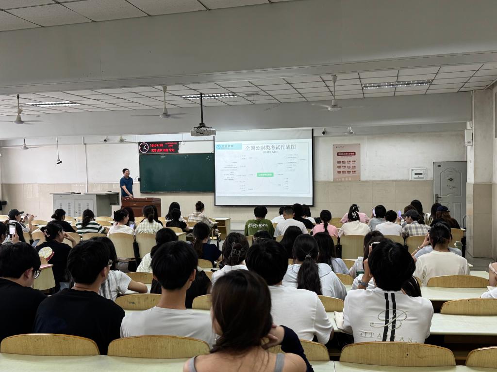 会上,叶灵鹏结合当前公职考试趋势,深入分析了考公形势。他指出,近年来公务员报考人数持续攀升,竞争日趋激烈,但经济与管理类专业因岗位适配性强,仍具备显著优势。他详细解读了考公全流程,从选岗策略、备考资料选择到笔试备考重点,提供了系统性指导,并鼓励学生结合自身特长制定差异化备考方案。