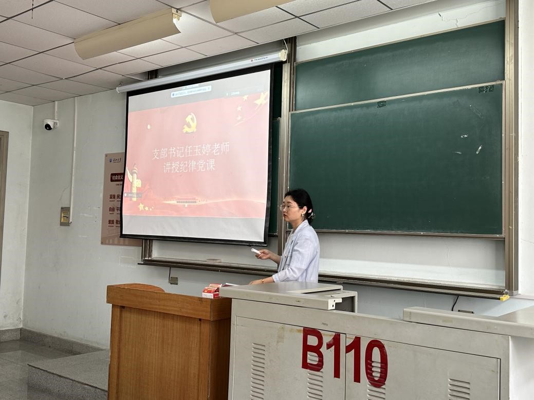 会议第三项:支部书记任玉婷以“守党纪、严纪律、抓落实”为主题讲授纪律党课。她讲到,第一,强化纪律意识。全体党员要不断提升党性修养,增强纪律意识,真正做到心有所畏、言有所戒、行有所止。第二,深化学习教育。党支部要常态化开展纪律教育,结合党史学习教育、主题党日活动等载体,深入学习党章党规,弘扬党的优良传统,提升纪律执行力。第三,加强监督执纪。党支部要加强对支部党员的教育和监督,对学生党员违纪行为“零容忍”,做到发现一起、通报一起,坚决维护党的纪律严肃性。第四,完善党支部的建设机制。要根据实际情况,不断健全完善支部各项规章制度,形成用制度管人、管事的长效机制,确保纪律规矩执行有力、落实到位。