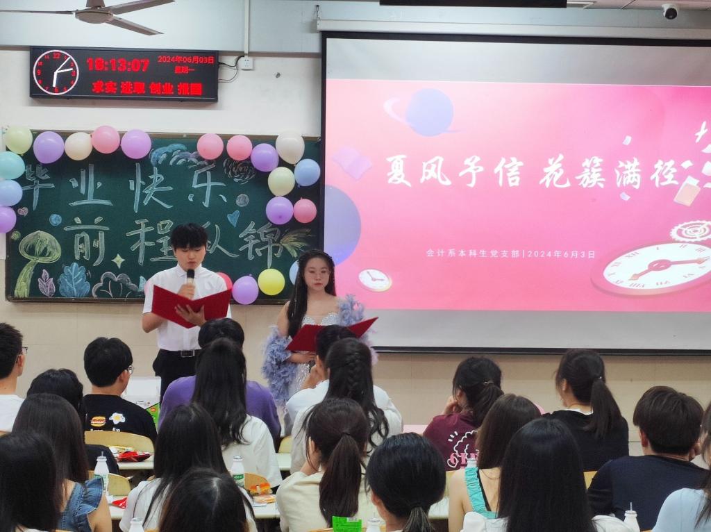 (通讯员 彭文桦/文 冯亚枝 任爽/摄)在2024届本科生毕业之际,为表达对毕业生党员们的真切感激与美好祝愿,勉励他们不忘来时路,奋进新征程,304永利集团官网入口会计系本科生党支部于2024年6月3日在12教103举办“夏风予信,花簇满径”主题欢送会。党支部书记桂凯丽、学生辅导员方含之以及党支部全体学生党员参加本次欢送会。