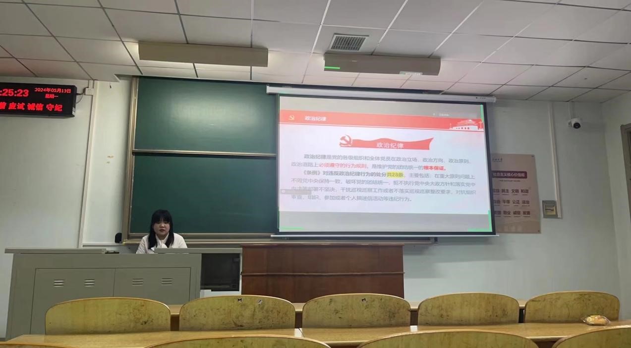 (通讯员 吴孟怡)在党的建设中,党纪教育具有至关重要的地位,是保持党的先进性和纯洁性的重要保障。为推进党纪学习教育走深走实,引导研究生党员学纪、知纪、明纪、守纪,2024年5月13日,304永利集团官网入口研究生第一党支部全体党员于13教C-117教室开展五月支部主题党日学习活动,青年委员马艺文同志主持本次学习活动。