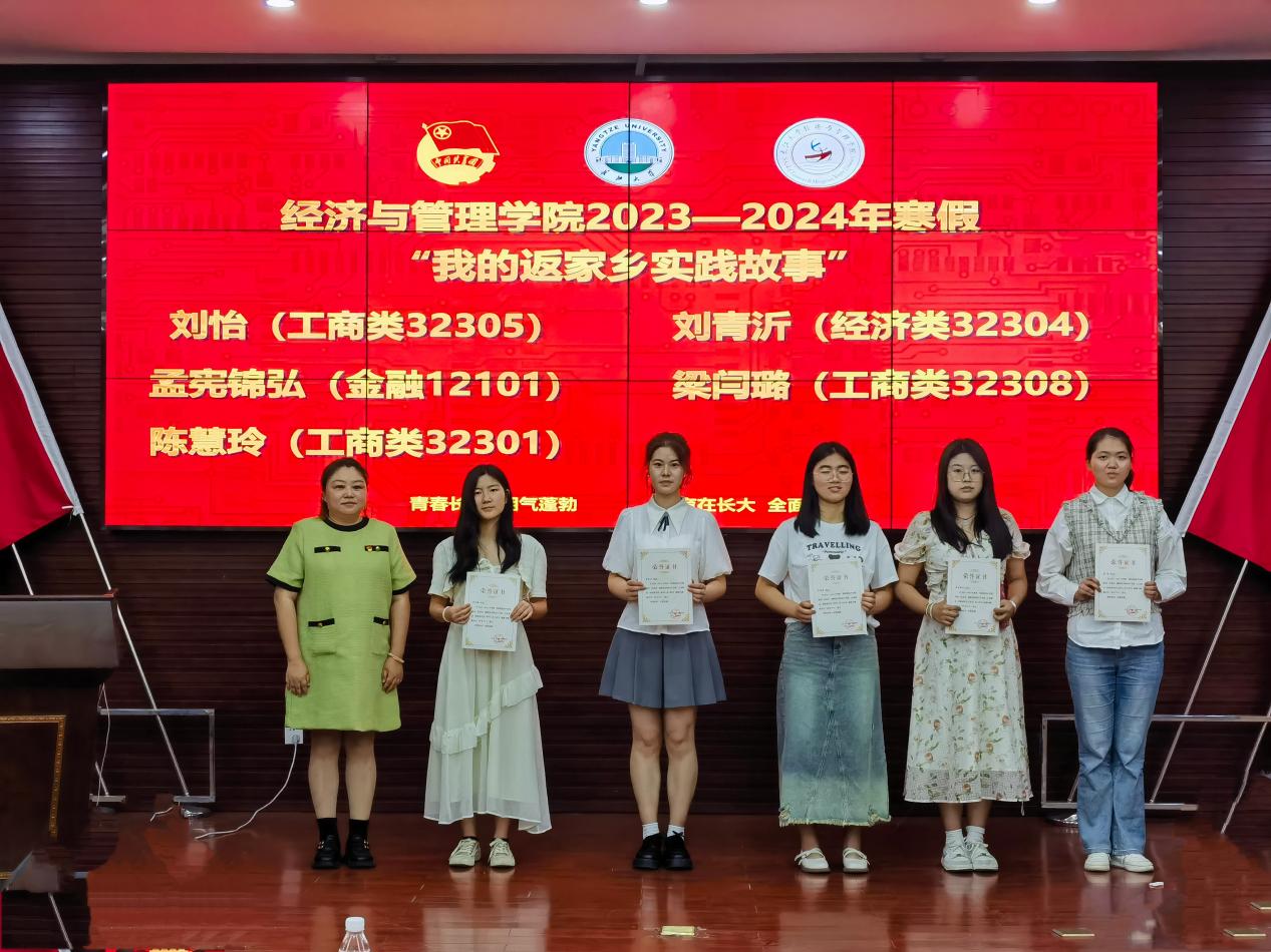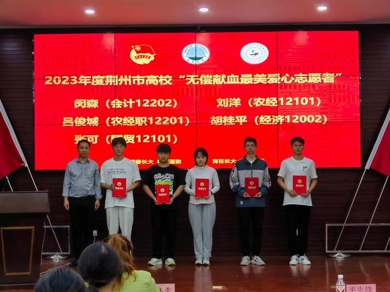 主持人王璐佳宣读学院志愿服务表彰文件,会计12202班闵森、农经职12201班吕俊城、国贸12101班张可、农经12101班刘洋和经济12002胡桂平5名同学获2023年度荆州市高校“无偿献血最美爱心志愿者”,工商类32305班刘怡、金融12101班孟宪锦弘、工商类32301班陈慧玲、经济类32304班刘青沂和工商类32308班梁闫璐5名同学获304永利集团官网入口2023—2024年寒假“我的返家乡实践故事”优秀个人,大家先后上台接受表彰。