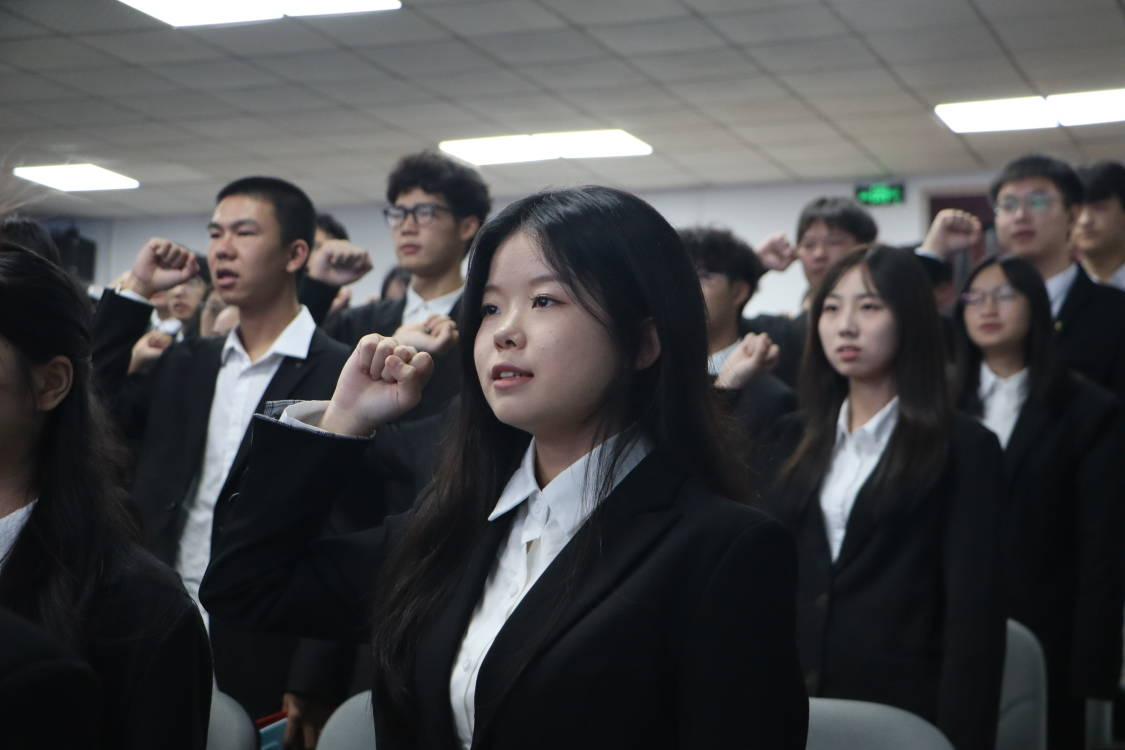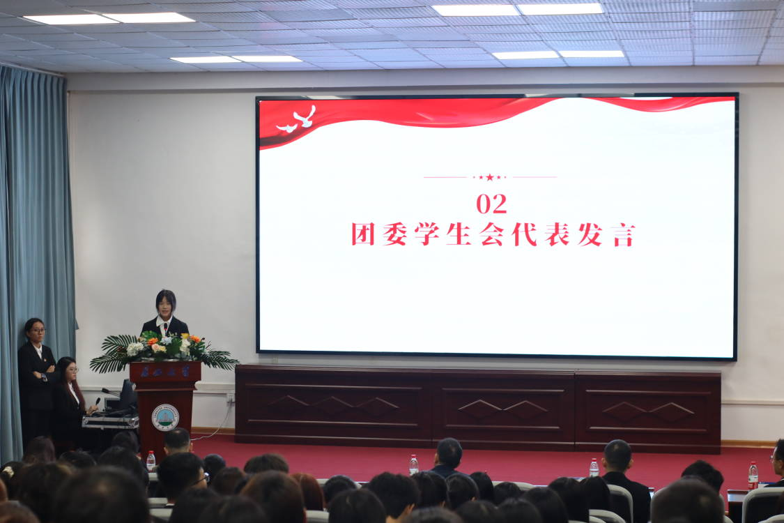 伴随着暖场音乐《有我》,大会在庄重肃穆的氛围中拉开序幕。会议伊始,综合事务部副部孙慧珂、组织部干事刘佳欢作为学生代表发言,他们明晰责任与义务,在汇报中做出庄严承诺。