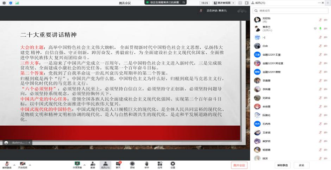 金融32201班团支部通过线上学习,更加深刻地领悟到党的二十大是一次高举旗帜、凝聚力量、团结奋进的大会,在党和国家发展进程中具有极其重大的历史意义。大家纷纷发表学习体会,进一步坚定了“六个必须坚持”、明确了中国共产党的中心任务。宣讲结束后,青年学子们再次加深了对党的二十大的认识,加强了对习近平总书记重要讲话精神的理解。