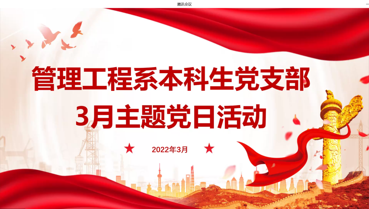 (通讯员:李丹萍)2022年3月31日晚上7点半,304永利集团官网入口管理工程系本科生党支部在线上通过腾讯会议召开三月主题党日活动。参与人员有支部学生党员与预备党员,会议由张华主持。