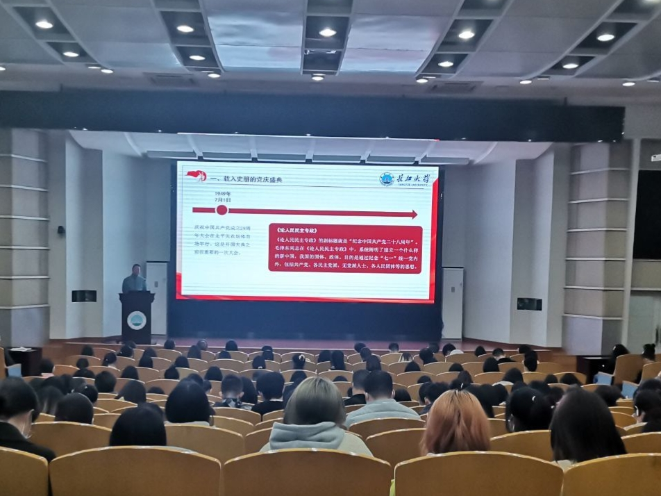 会议伊始,娄君庭老师表达了对全体与会成员积极入党的真切肯定,以及对同学们在未来学习生活中蒸蒸日上的殷切希望。此次会议中,主讲人陈松林教授以习近平总书记“七一”重要讲话为引子,展开了对建党百年历史的倾情讲述,从1921年中国共产党成立的艰难,到1949年中共党员取得阶段性成果——中华人民共和国成立。陈松林教授慷慨激昂的讲述,将同学们带入了那个艰难的时代,让同学们为中共党员坚韧不拔的精神所动容。如今“不可逆转”的百年辉煌背后是千千万万中共党员毕生之作,实现中华民族伟大复兴第二个百年奋斗目标不仅是中国共产党对全国人民的一场政治宣言,更是全体党员要坚持以史为鉴、开创社会主义现代化强国的行动指南。实现中华民族伟大复兴,必须高扬伟大建党精神。