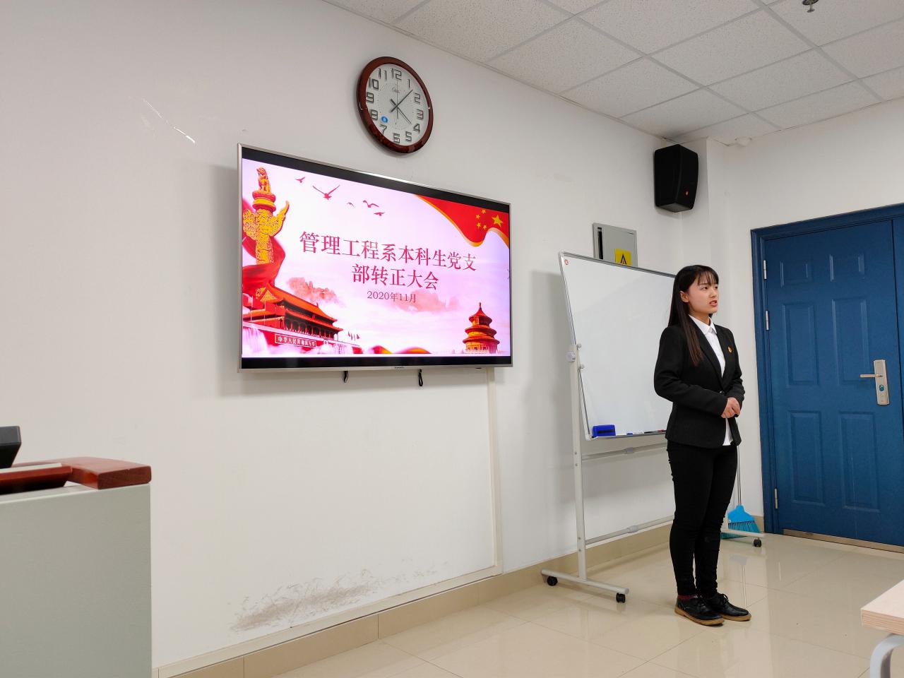 (通讯员 张洋)2020年11月26日下午16点,304永利集团官网入口管理工程系本科生党支部于文科大楼417召开了预备党员转正大会。由于疫情原因,黄芊同志以线上腾讯会议的方式同步参会。会议讨论关于黄芊等4位同志按期转正的问题。参会人员有党支部书记李博老师、6位正式党员与19位预备党员。本次会议由陆媛主持。