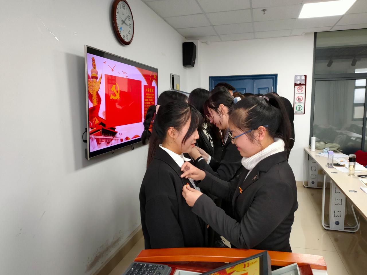 会议伊始,支委会各成员分介绍了会议流程、确定了参会人数并且明确会议纪律。紧接着,以杨育同志为代表的9名发展对象分别从入党动机、学习、工作等方面做出了汇报。在发言完毕后,发展对象们接受了党员同志们的批评指正。经过6位正式党员的投票后,最终确定杨育等9名同志发展为预备党员。在陆媛同志的带领下,全体党员在庄严的党旗下宣读入党誓词。