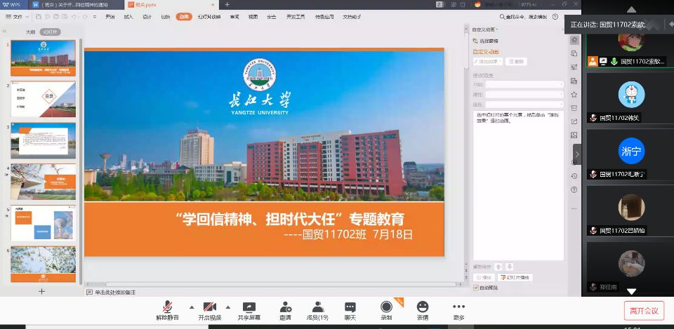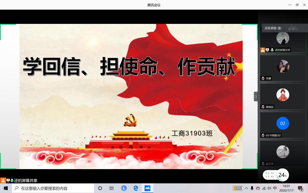 学院通过班级QQ群、微信群等媒体召开线上主题班会,学习小组召开线上座谈会,由辅导员和学生干部带领学生一起学习回信精神。有的班级通过学习回信精神,结合《习近平的七年知青岁月》、《习近平与大学生朋友们》,组织学生谈学习心得;有的班级请代表结合自身实际发言,比如抗疫志愿者、党员、入党积极分子、创新创业先锋、未来打算考公务员或选调生服务基层的学生,讲讲如何将小我融入大我,青春献给祖国,投身强国伟业;有的班级还结合学习回信精神,开展演讲活动,理论学习我来讲,用青年学子的声音,讲述青年成长故事,讲述中国故事;有的班级设置了一个“青春告白祖国环节”,学习习近平总书记回信精神,内化于心,外化于行,为祖国勤学修德,以实践明辨笃实。全院各个班级和学习小组以多种形式夯实学习成果,心有所信,方能行远。