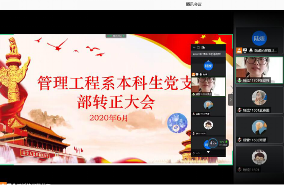 2020年6月5日下午两点,304永利集团官网入口管理工程系本科生党支部在线通过腾讯会议召开了预备党员转正大会。参与此次会议的有管理工程系本科生党支部书记李博、学生党员与预备党员,会议由陆媛主持。