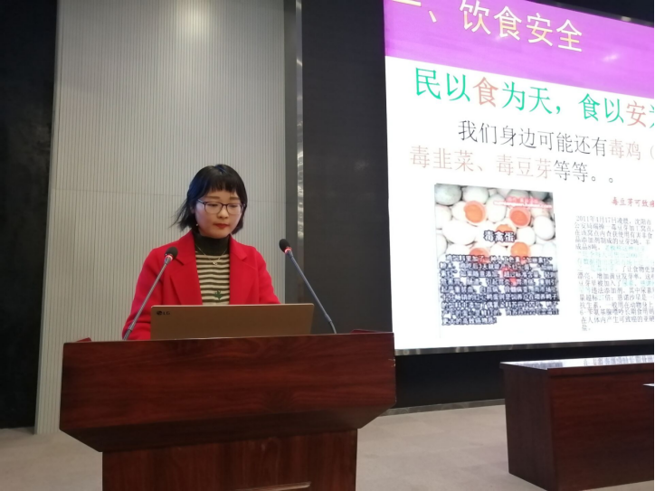 讲座伊始,任玉婷老师对安全教育做了简要概述,随后从饮食、住宿、出行三个方面进行详细讲解。首先,她提醒同学们要注意饮食安全,她强调“保障食品安全,刻不容缓,食品污染对同学们的身体健康危害巨大,食品安全与同学们的日常生活密不可分。同学们应主动学习一些卫生小常识并养成良好的饮食卫生习惯。”