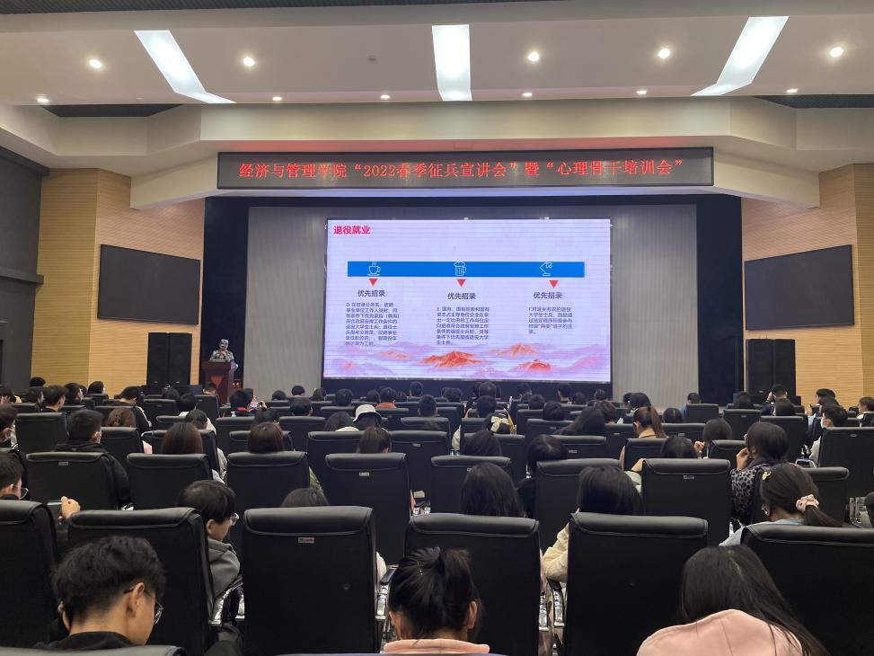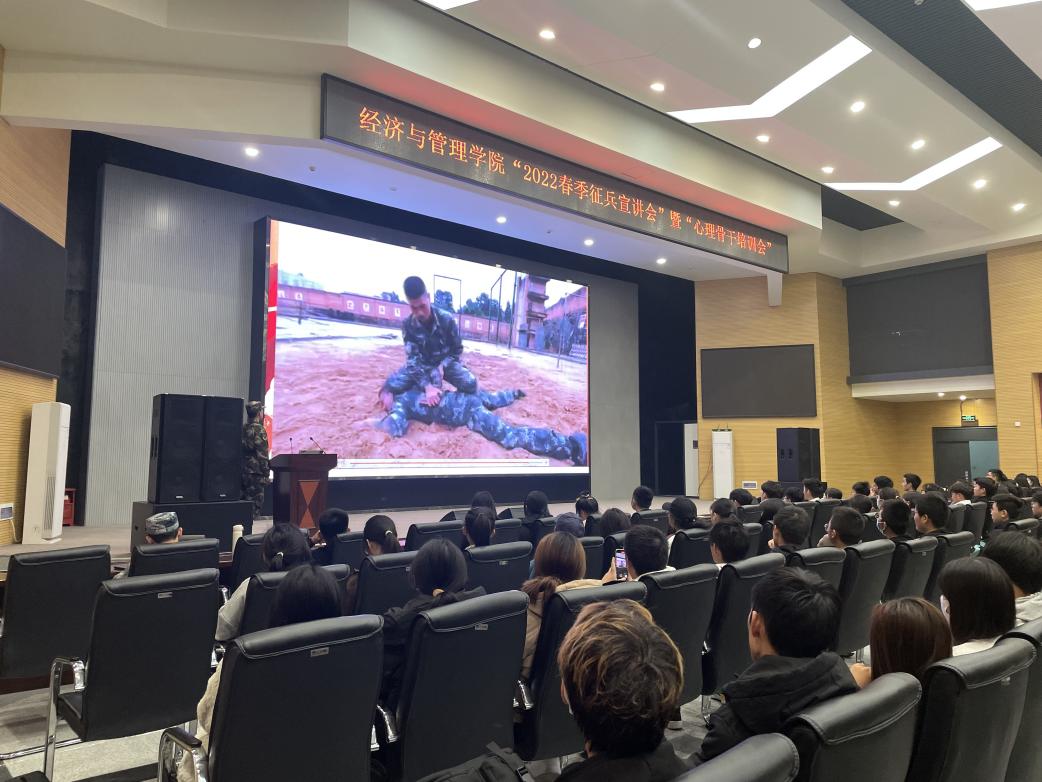 (通讯员:单晴蜓)304永利集团官网入口于11月19日晚19点在西校区农科大楼1058报告厅召开了2022年春季征兵宣讲会。本次会议由郭俊老师主持,言简意赅地强调了会议秩序,并对李东俊同学和殷博同学这两名304永利集团官网入口征兵宣讲员表达了热烈的欢迎。两名宣讲员分别从军旅生活和征兵政策两个部分对同学展开宣讲。