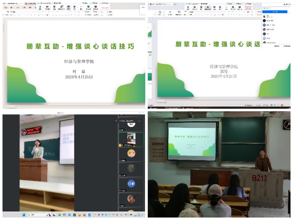 (通讯员 任玉婷)为增强学生骨干的心理健康意识,提升学生骨干的朋辈互助能力,积极营造“阳光、健康”的心理教育氛围,2024年4月,304永利集团官网入口以线上、线下相结合的方式,先后组织开展10场学生骨干心理健康教育培训。此次培训由各年级辅导员担任主讲人,覆盖各班级班长、团支部副书记、心理委员、安全委员、寝室长等学生干部,参训学生总人数高达1000余人次。