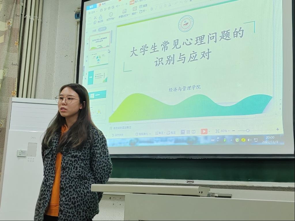 方含之老师围绕认识心理健康、有意识地关注重点学生、善于自助和助人三个方面内容,援引自身经历,多角度、深层次分析大学生中存在的各种心理问题,就大学生面临的困难情境进行生动有趣的讲解。会上重点介绍心理健康的标准、大学生的身心特点、大学生常见心理问题的识别与应对等内容。