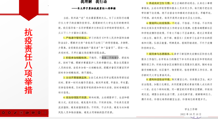 会议伊始,朱老师传达了学校党委发布的《致全校师生的一封信》和学生工作部发布的《长大学子勇担抗疫责任八项举措》,向学生介绍了疫情防控相关文件精神。要求永利集团官网研究生严格遵守管控规定,积极参加核酸检测,主动开展健康监测,珍惜医疗资源,规范参与志愿服务,养成良好卫生习惯,构建和谐宿舍环境,营造同心抗疫氛围。