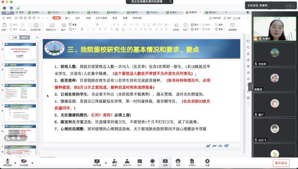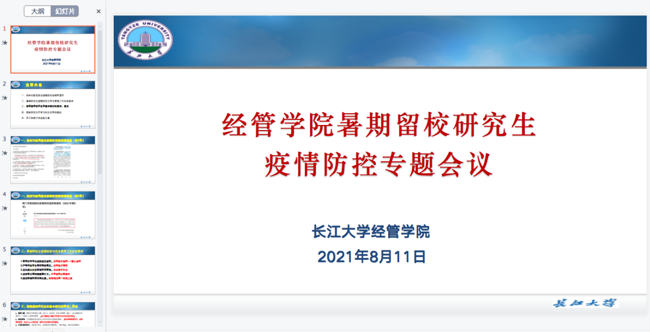 会上,朱老师首先传达了近期荆州市和学校关于疫情防控的重要指示及相关通告精神;对暑期研究生疫情防控与安全管理工作提出了总体要求:禁止学生返校;非审批不离校;坚持每日健康打卡、尽快接种疫苗等。另外,朱老师对学生身心健康、学习状态、求职规划给出了诸多建议,为开学做好准备。