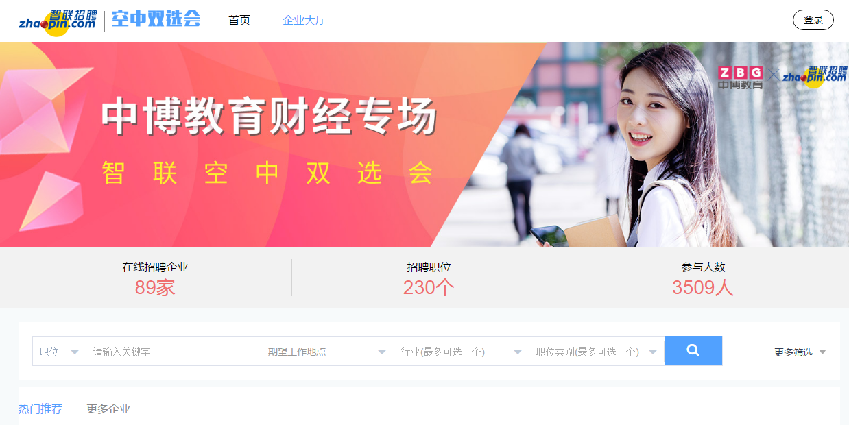 本次中博教育携手智联招聘重磅推出财经专场空中双选会,针对经管大学生,精选众多财会及金融类职位,推荐优质岗位资源。不仅有包括八大在内的会计师事务所,国企、明星民营企业、优质外企也尽在其中。各位求职大学生进入空中双选会页面后,直接选择心仪企业投递简历、在线留言HR可面试时间,等待HR联系确定时间后,便可进行线上视频面试,为毕业生求职提供了极大的便利。